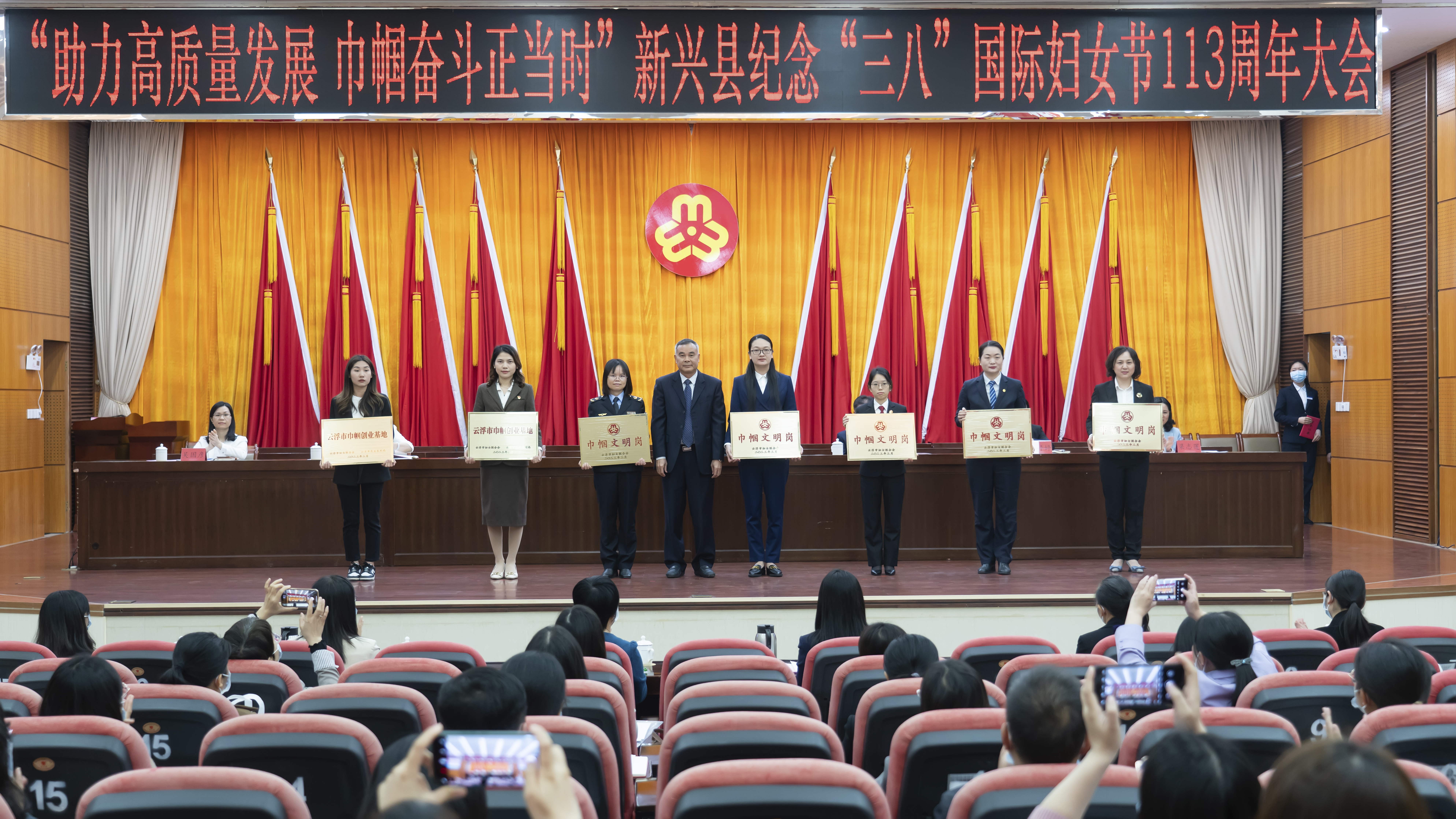 會上,陳哲江、肖志堅、梁國華、趙婷婷、梁志蓮分别爲全國巾帼建功先進集體,2022年廣東百戶“最美家庭”,雲浮市巾帼文明崗、雲浮市巾帼創業基地,雲浮“最美家庭”,雲浮市性别平等教育試點學校等先進集體和先進個人進行頒獎。其中,廣東翔順金水台溫泉小鎮有限公司房務部在本次大會被評選爲“巾帼文明崗”,現場由翔順金水台房務部經理伍蘭英代表領獎。